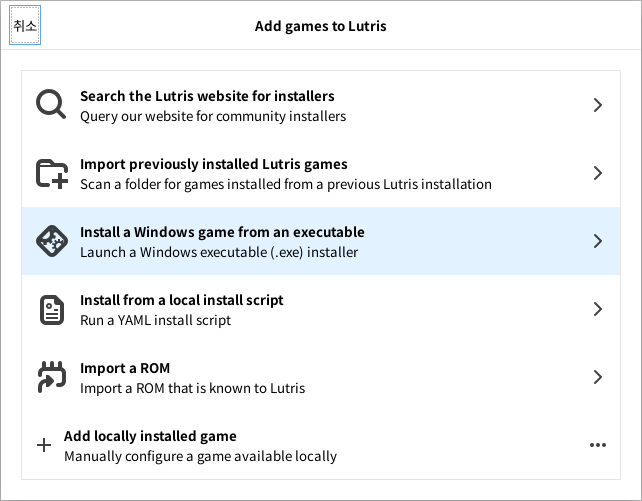 여기서 Install a Windows game from an executable을 선택합니다.