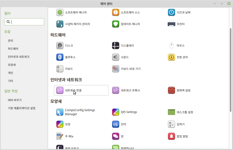 우선 제어판의 네트워크 연결로 들어갑니다. 저는 민트를 쓰지만 우분투도 제어판 형태는 비슷합니다.
