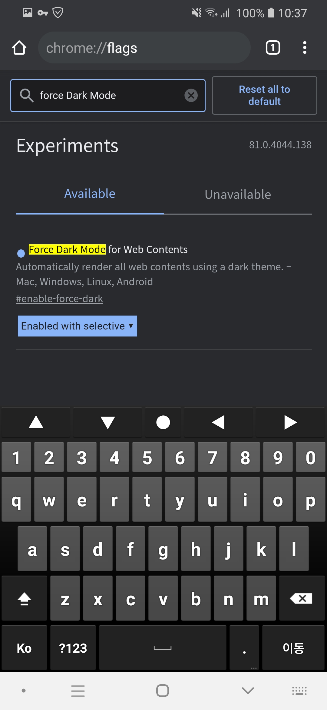 이러면 실험실기능화면이 뜹니다. 그 다음 검색버튼을 누르고 Force Dark Mode를 검색하면