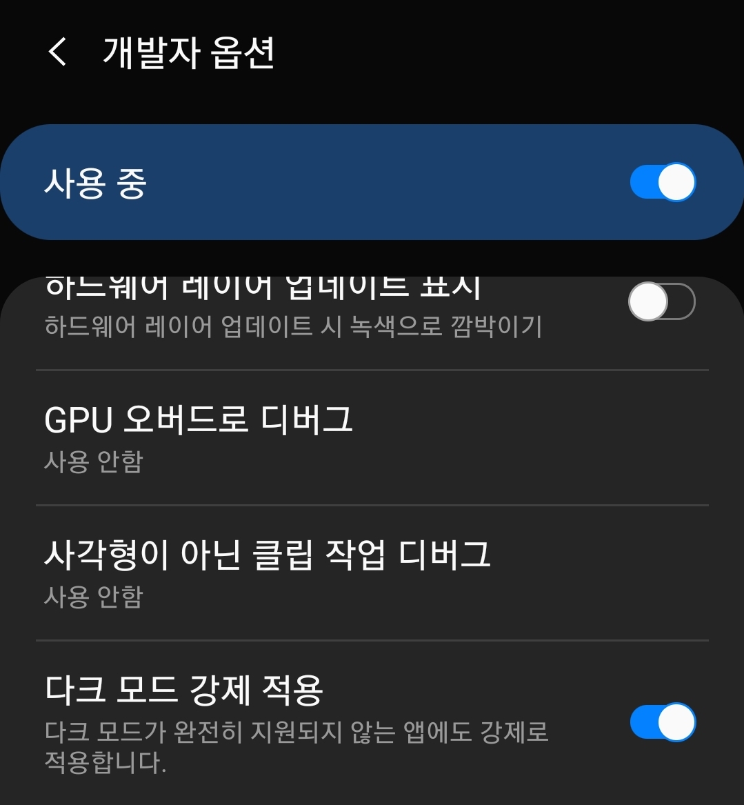 우선 강제다크모드는 안드로이드10 이후에 개발자 옵션에 있습니다. 다크모드에 관심이 있으실 정도면 개발자옵션을 활성화 하는것 정도는 아실거라 믿고