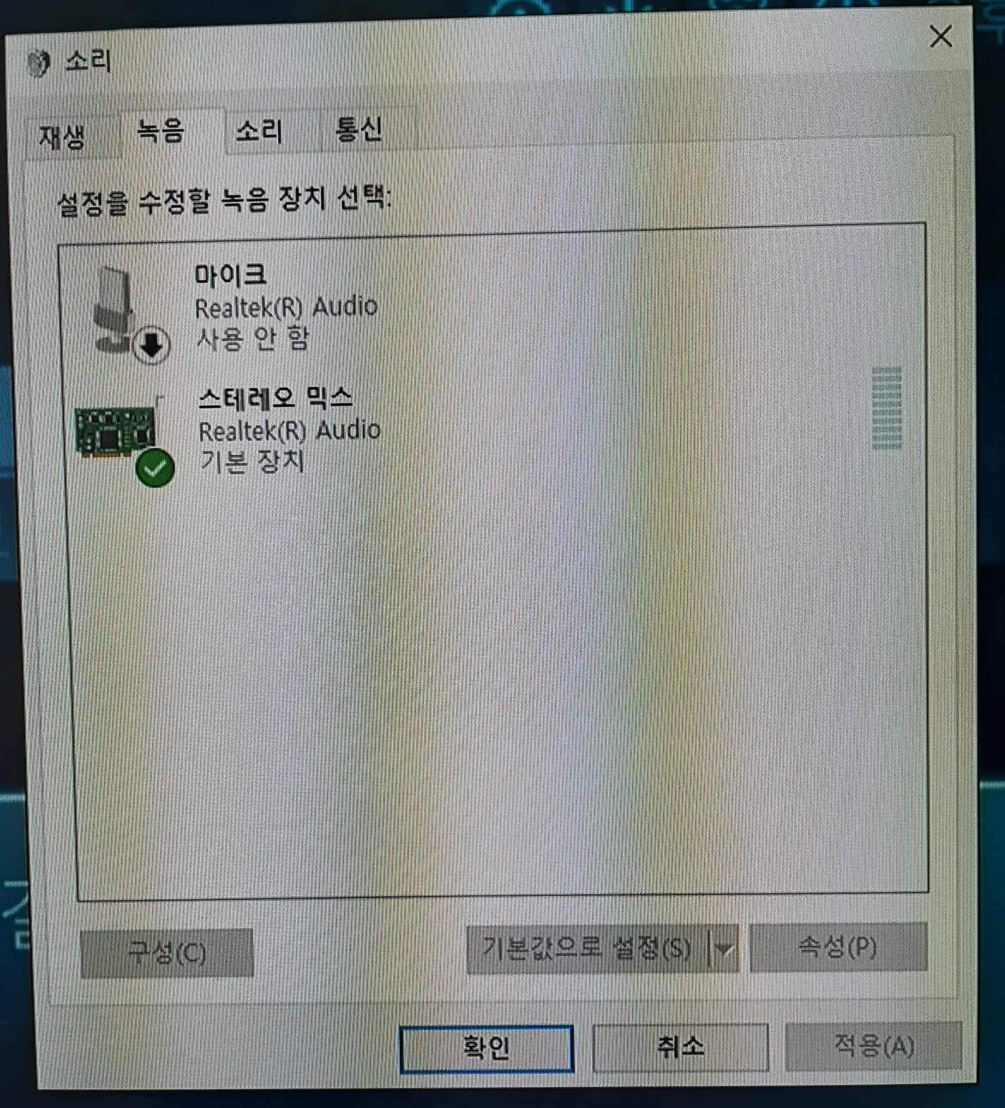 그리고 진짜 핵심은 마이크(녹음)장치를 데스크탑사운드 혹은 스테레오믹스라 불리는 장치로 설정하는 겁니다.