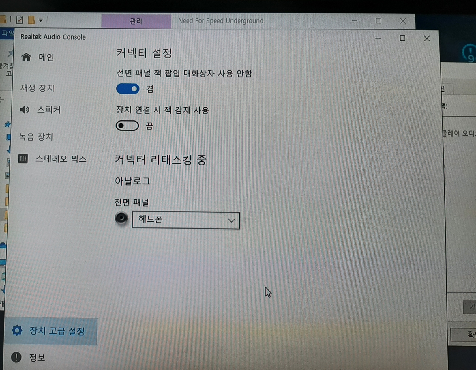 만약 아날로그 활성화가 안 될경우 헤드셋이나 이어폰이 인식이 안 된것입니다. 제어판을 통해 강제인식시키거나 리얼텍 아날로그 제품은 Realtek Audio Console에서 장치 고급설정을 통해서 강제 활성화가 가능합니다.