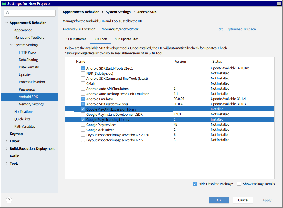 SDK Platforms 탭에선 23버전 (Android 6.0)을 설치하고 그리고 제일 중요한 SDK Tools 탭에서 Google Play APK Expansion library 와 Google Play licensing Library 두가지를 체크한뒤에 Apply를 누르자.