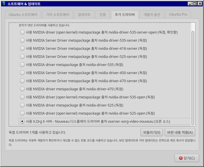 그리고 Nouveau로 우선 되돌려 줍니다. 이건 우분투 개발자들이 관여하기에 다른게 꼬여도 문제는 일으키지 않습니다.