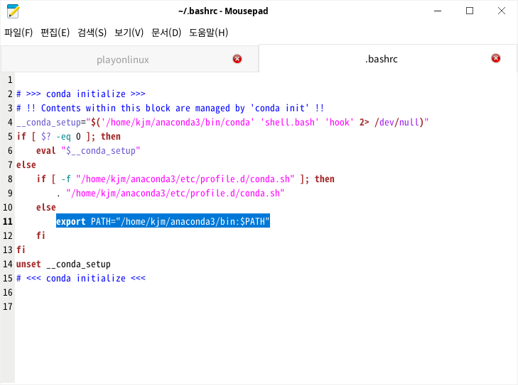 우선 Anaconda 실행시 바로 conda가 실행 가능한 이유는 .bashrc에 이런 코드가 추가되기 때문입니다.