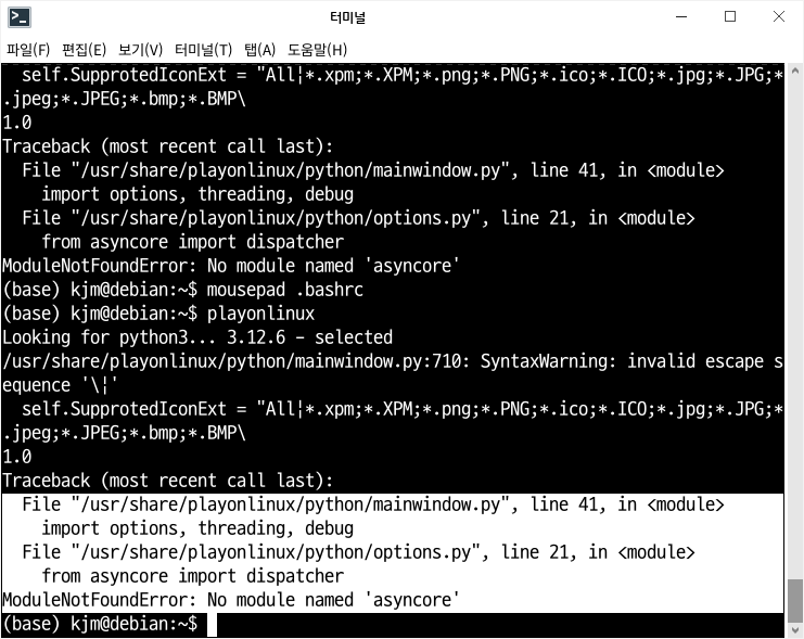 python3.12 이상부터는 playonlinux에서 사용하는 패키지중 asyncore가 deprecated 되었습니다. 본래는 파이썬 기본패키지였으나 이제는 사라졌기에 3.12가 아닌 구버전을 쓰거나 3.12에 맞춰서 다시 설치해줘야 합니다.