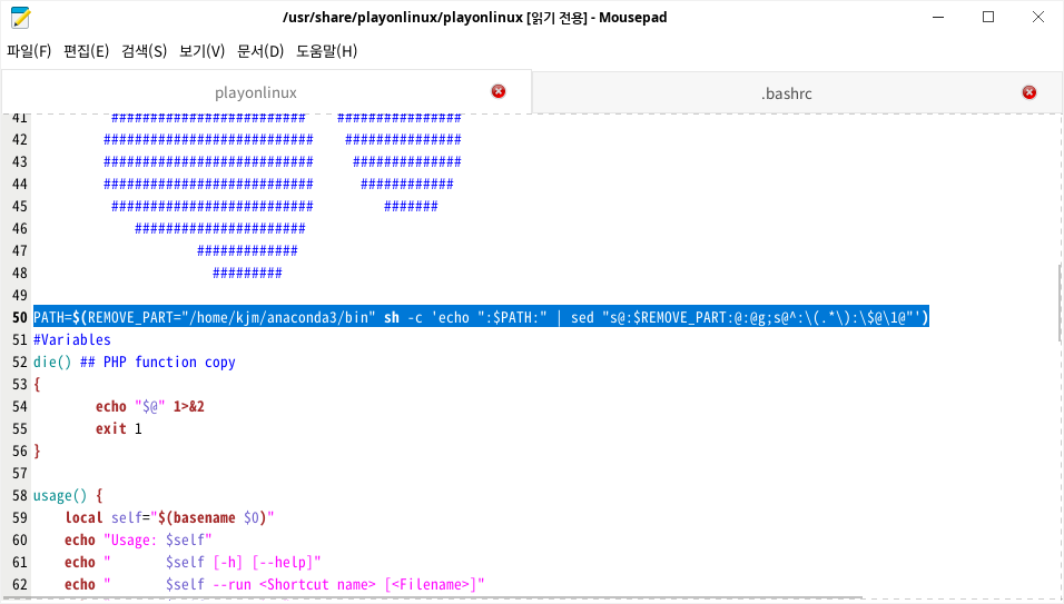 등등으로 편한 텍스트 에디터를 관리자권한으로 /usr/share/playonlinux/playonlinux 파일을 엽니다.