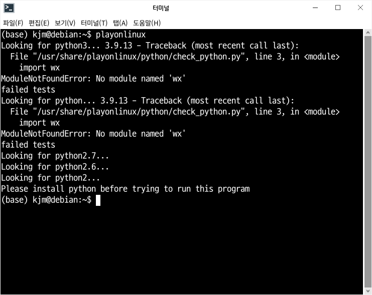 문제는... 이게 Playonlinux에서 사용하는 Python이랑 충돌이 난다는겁니다. 기본 Anaconda의 Base 파이썬과 시스템에 설치된 Python은 서로 다르기 때문에 문제를 펑펑 일으킵니다.