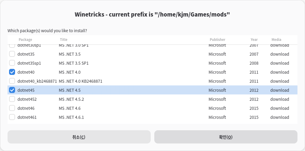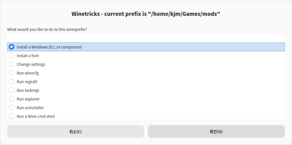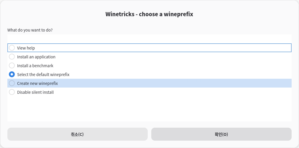 그리고 설치가 완료 되면 winetricks 창이 뜨게 됩니다. 이러면 모든 것이 완료 된것이니 취소 버튼을 눌러서 Winetricks 창을 닫으면 됩니다.