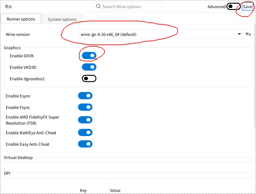 여기서 Wine Version을 아까 설치한 것으로 바꾸고 Enable DXVK를 활성화 해주시면 됩니다. FSR이나 Anti-Cheat는 그냥 꺼도 됩니다. 사실 게임용 옵션인데 저희는 게임을 설치할게 아니니까요. 오른쪽 위에 SAVE 까지 눌러줍니다.
