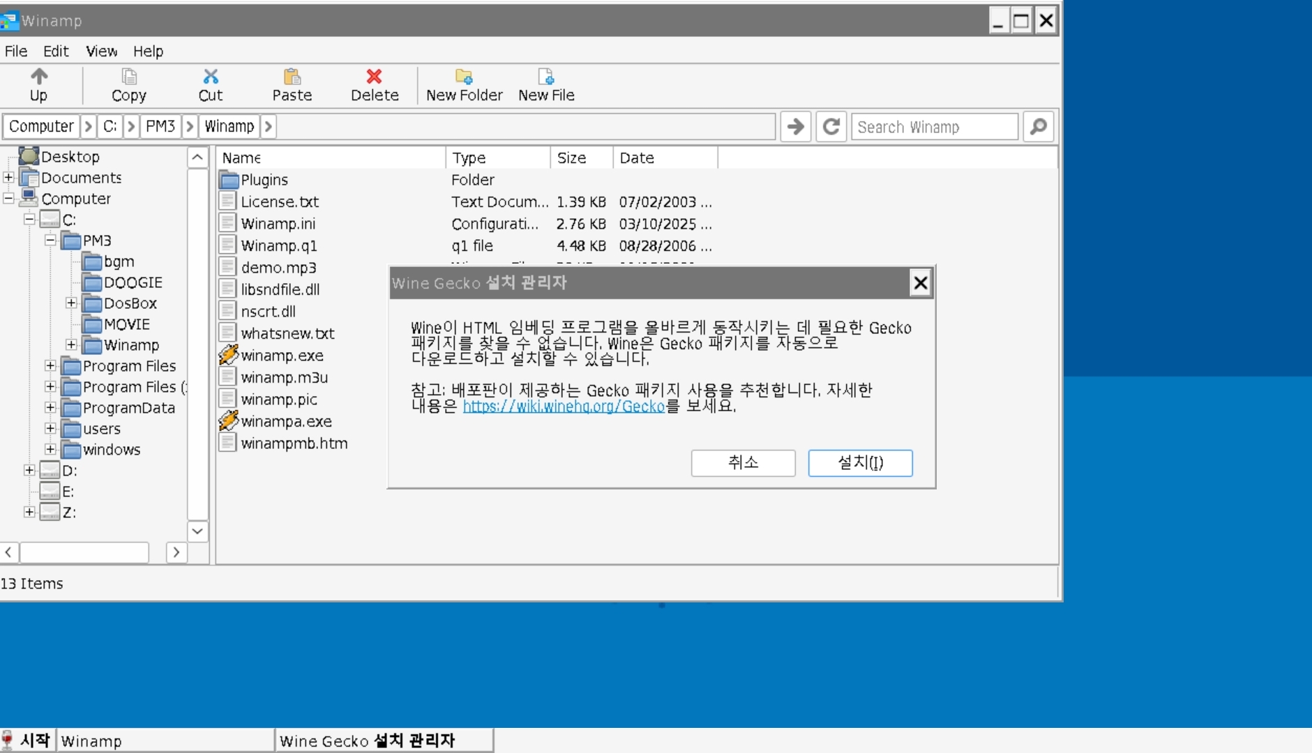 시작-System Tools- Wine Gecko Install을 눌러 WineGecko를 설치하거나 그냥 Winamp폴더의 winamp.exe를 따로 실행해서 WineGecko를 설치합니다.
