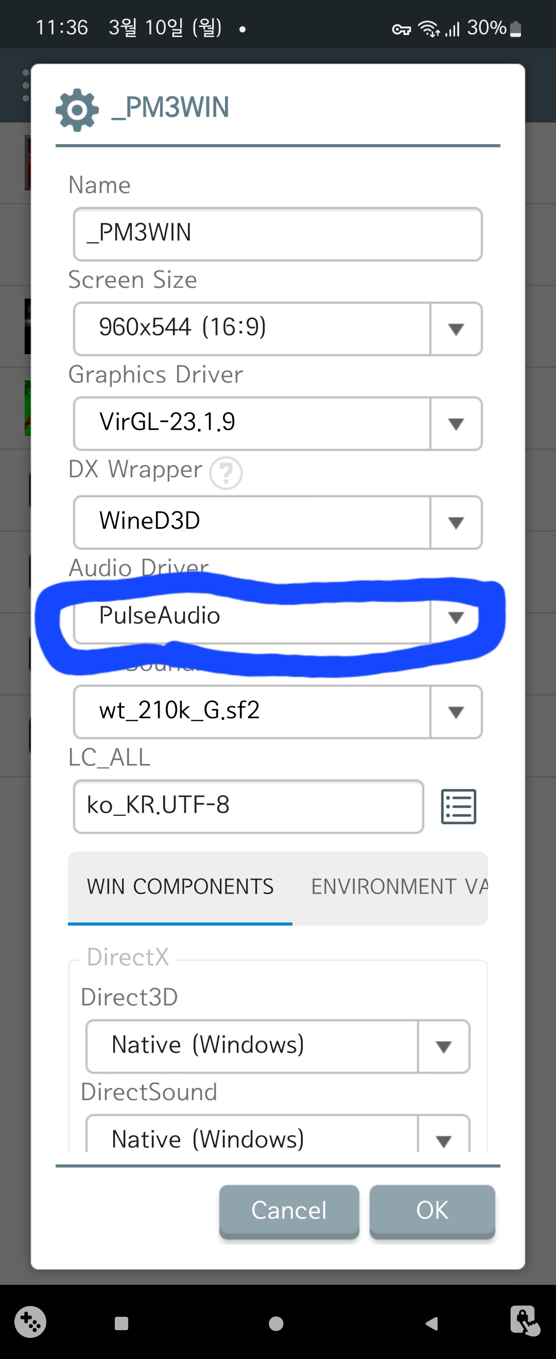 CD-DA가 되어야 배경음악이 나올텐데 이게 말을 안 듣습니다. 이것도 일종의 호환패치인데 아쉽더군요. 리눅스 PC에서는 따로 가상드라이브를 만들어서 해당 ISO파일을 넣는 방식으로 음악을 들었는데 Winlator에선 안 되니 아쉽네요. _inmm이 이용도로 나온건데 아쉽네요.(WMP를 설치하면 된다는 이야기도 있는데 안 해봤습니다.)