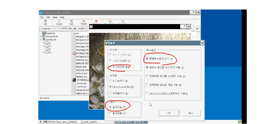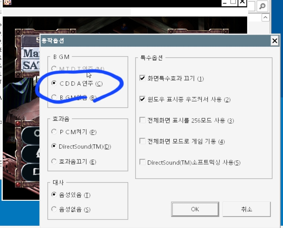 CDDA연주는 무슨이유인지 계속 오류가 나면서 귀찮아 지는 문제가 있습니다. 그렇기에 BGM을 꺼버리는게 동작하는데 가장 좋습니다. 다만 아래의 Winamp방식으로 바꿔서 재생하니 제대로 된 음악을 들을 수 있었습니다. 제일 아래 설정 참조. 다만 Winamp가 따로 돌아가다보니 휴대폰에 불이나려 합니다. 그냥 끄는게 정답일수도 있습니다.그리고 화면 특수효과도 꺼주셔야 게임할때 안정적으로 돌아갑니다. 저게 켜지면 은근히 버벅거리더군요.