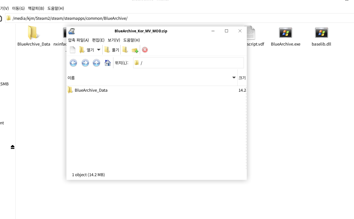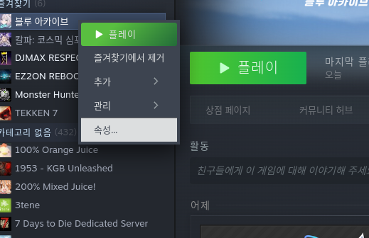 스팀 라이브러리에서 블루아카이브에 오른쪽 버튼을 눌러 속성에 들어갑니다.