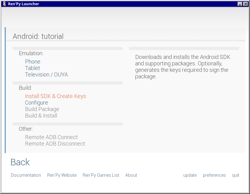 이제 Renpy를 다시 켜면 활성화가 안 되어있던 Configure가 활성화 되어있다.
