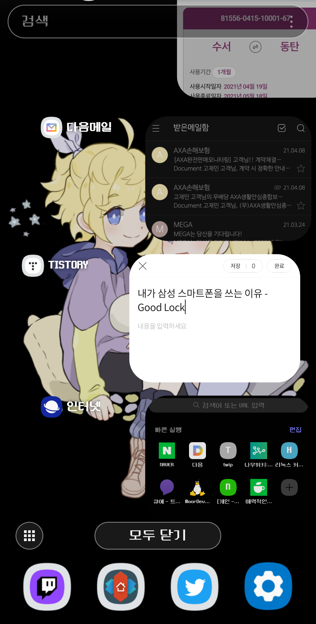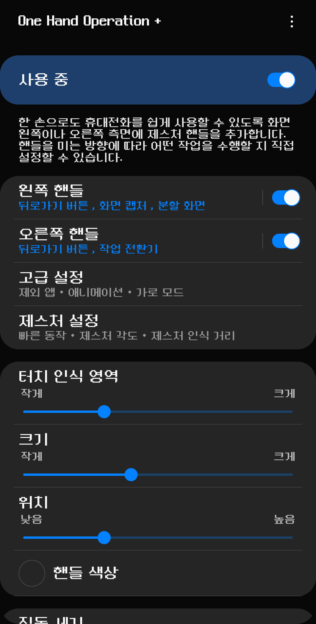 그리고 Good Lock의 기능은 아니지만 One Hand Operation +도 필수 앱으로 통합니다. 어딘가 부족한 제스처 기능을 보조해주고 편하게 옆으로 쓰는것으로 스크린샷을 찍는다거나 뒤로가기 기능을 할 수 있습니다. 쓰다보면 저도 모르게 모서리에서 손가락을 움직이는 자신을 볼 수 있습니다.